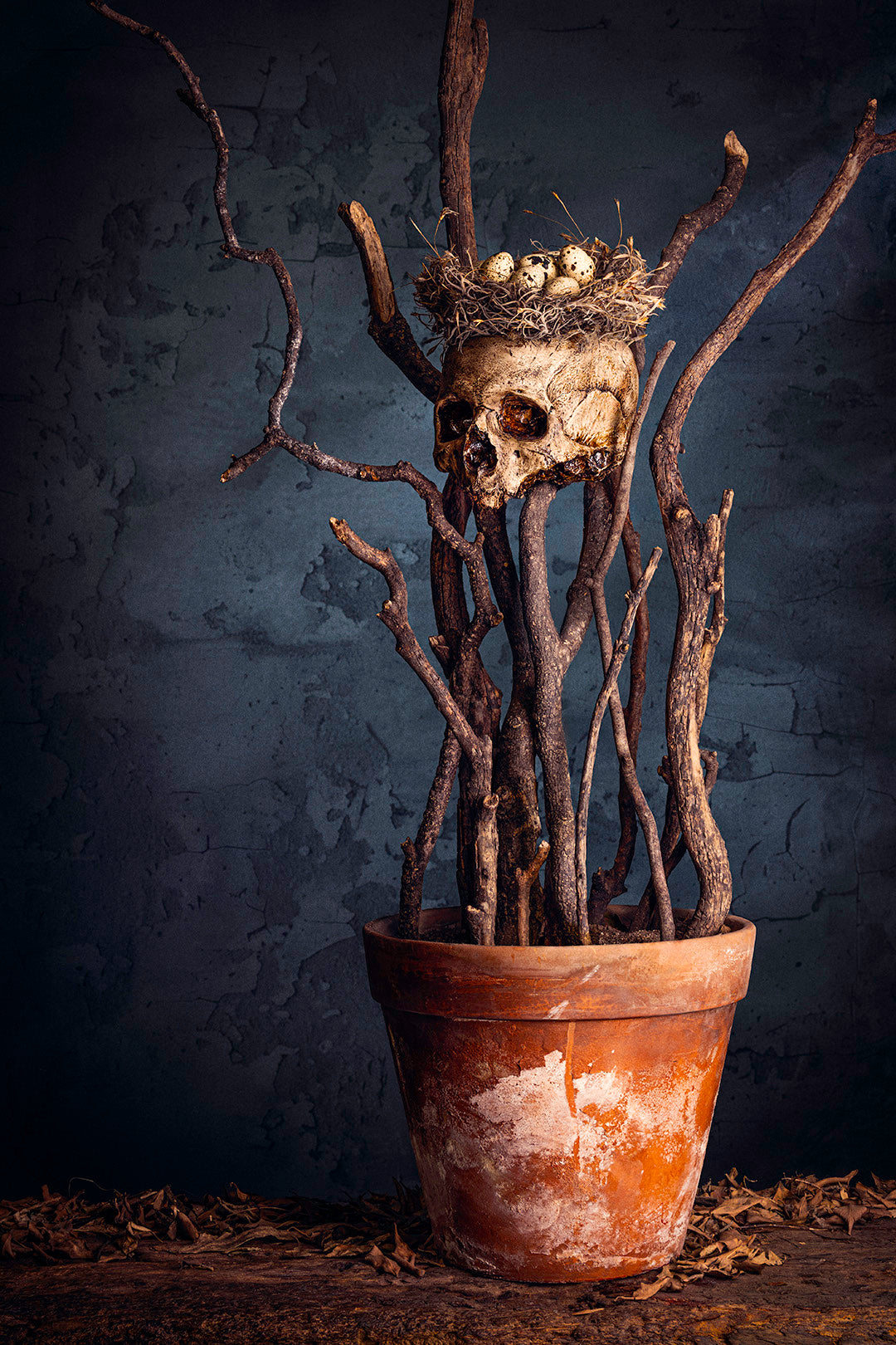 A skull supports a nest containing intact eggs. Rather than presenting death as conclusion, the image frames it as threshold. The work reflects on continuity, incubation, and the possibility held within what remains. Absence becomes shelter—an origin point rather than an ending.