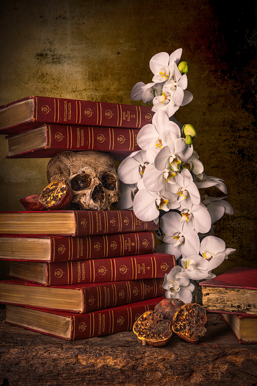 A tower of encyclopedias stands intact yet voiceless, accompanied by dried pomegranates and a single branch of white orchids. This image addresses erosion rather than dramatic loss. Knowledge persists physically while meaning fades. Memory becomes fragile, dependent on naming. The work reflects on what disappears not through catastrophe, but through gradual neglect.