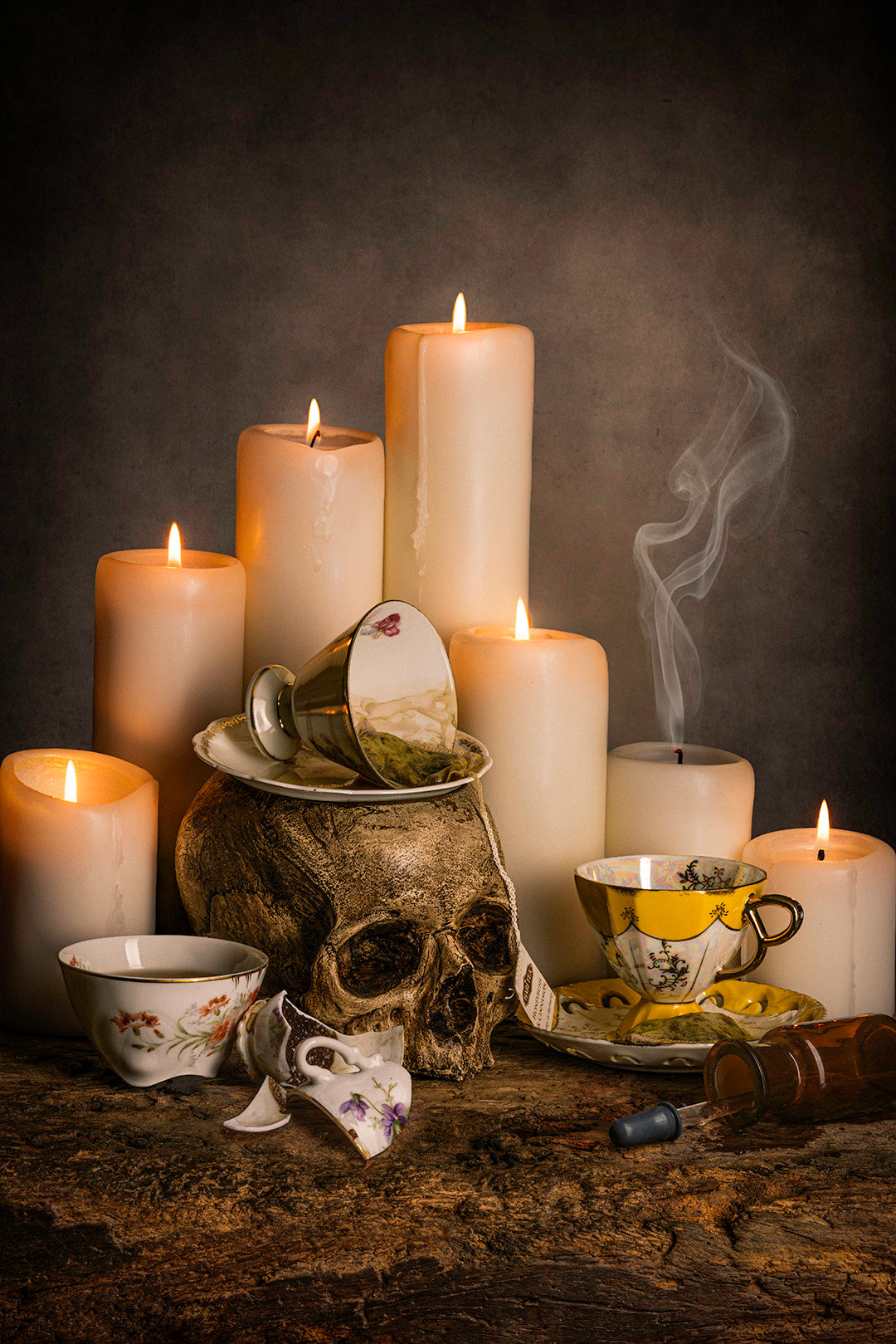 A staged table scene—cups, candles, a vial, and a skull—captures the aftermath of an irreversible decision. Everything is arranged, nothing disturbed. The image embodies stillness after action, inviting the viewer into a space where absence is palpable. It does not dramatize death; it presents its residue.